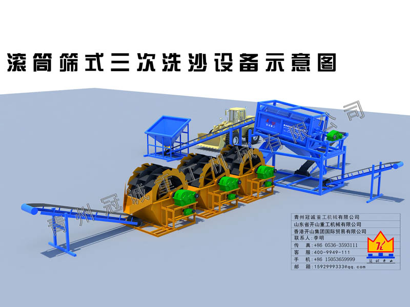 每小時(shí)80-100m3處理量滾筒篩式三次洗沙設(shè)備技術(shù)參數(shù):設(shè)備占地總長(zhǎng)度約25米