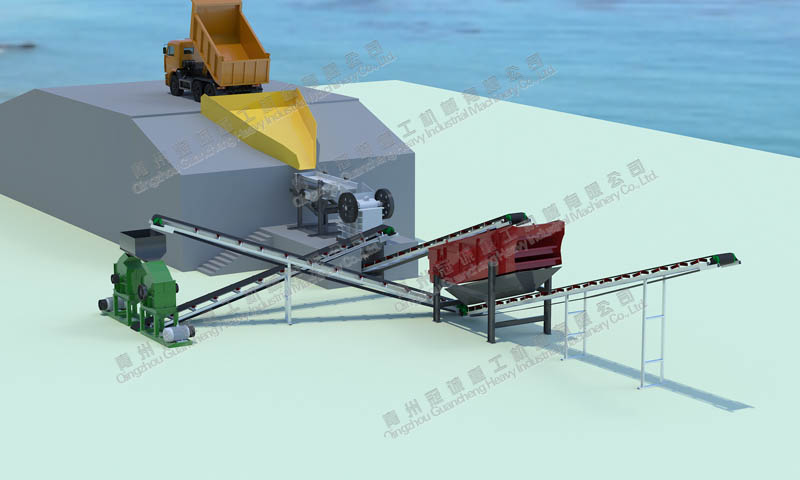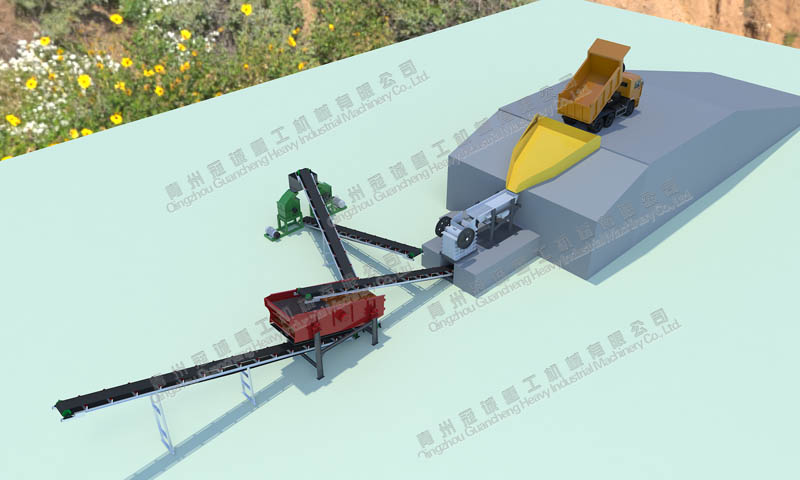 原料通過(guò)工程車(chē)輛送入進(jìn)料斗,由進(jìn)料斗進(jìn)入振動(dòng)給料機(jī)內(nèi)均勻給料進(jìn)入一臺(tái)600*900鍔式破碎機(jī)或者一臺(tái)1416#重錘破碎機(jī)內(nèi)進(jìn)行粗破,破碎后的物料通過(guò)上料輸送機(jī)送入一臺(tái)2160#振動(dòng)篩內(nèi)進(jìn)行篩選分級(jí)為:4mm以下與4mm以上兩種規(guī)格;