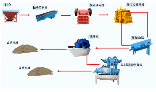 對于一套完整的水洗砂生產(chǎn)線來說,其除了包含有洗砂機這一核心洗砂設備外,其肯定還會含有制砂機,甚至還有粗、細碎破碎機(通常情況下,多為顎式破碎機與反擊式破碎機),用于完成對大塊砂石物料的粗、細碎作業(yè)。具體各設備之間配合生產(chǎn)工藝流程如下: